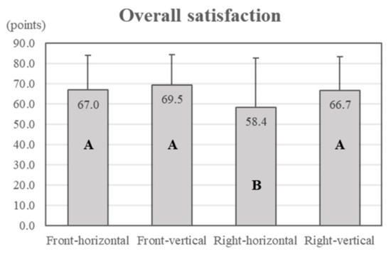 The driver’s evaluations of overall workload, usability, and satisfaction with their experience were confirmed according to the display type. Hence, the subjective questionnaire items of overall workload, overall usability, and overall satisfaction were analysed. From the analysis, overall workload and overall usability were not statistically significant (overall workload, p = 0.092; overall usability, p = 0.150; α = 0.05). Conversely, overall satisfaction was statistically significant (p = 0.014; α = 0.05). According to the post hoc results, front–horizontal, front–vertical, and right–vertical were found to form a group with no statistically significant differences in overall satisfaction. The right–horizontal display was statistically independent (Figure 5). Overall satisfaction was highest for the front–vertical display (69.5 ± 14.9 points) and lowest for the right–horizontal display (58.4 ± 24.3 points).