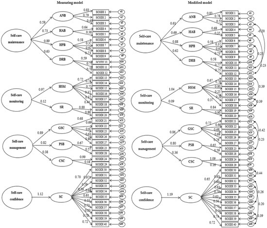 Overall, the exploratory factor analysis (EFA) results showed differences from items included in each factor of the original version. These differences in results might be due to different cultural and medical environments of Italy and Korea, social and demographic characteristics, and differences between study subjects. However, even if the original version and factors were separated differently, factor loadings of all items were all over 0.40, indicating that the items of the tool explained the concept well with the same meaning as the original version. In this study, we performed CFA along with EFA to verify the validity of the tool, unlike with the original version or the Farsi version because the SCODI tool had already been validated. In order to apply it by translating it into Korean, we further secured the validity of the developed tool by conducting CFA, which confirmed the suitability of the item composition of extracted factors [30]. The four dimensions of 40 questions of the original version were applied as they were and implemented. The CFA showed that the CR values of all dimensions were above 0.90. AVE values were all above 0.50, except for self-care maintenance at 0.40. Thus, the validity was confirmed. It was difficult to compare with this study because CFA was not implemented at the time when the original version was developed. This result means that the content of each item reflects characteristics of subfactors well. In addition, the revised model’s fit and results were also found to satisfy all criteria. Therefore, it was clearly distinguished from items included in other factors as an appropriate item for measuring each corresponding factor.