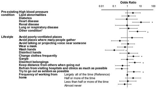 Odds ratio of COVID-19 infection by multivariate logistic regression for pre-existing conditions and lifestyle factors. * p < 0.05.