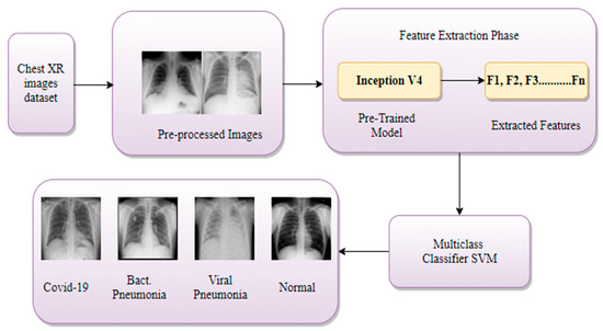 - Step 3: ClassificationAll the features are extracted using Inception V4 from Chest XR images and then the multiclass SVM (MSVM) classifier is applied. The classification with the proposed C19D-Net model classifies the Chest XR images into multi-classes as “normal”, “viral pneumonia”, “COVID-19” and “bacterial pneumonia” with high precision as associated with other models or methods as discussed below in coming sections.