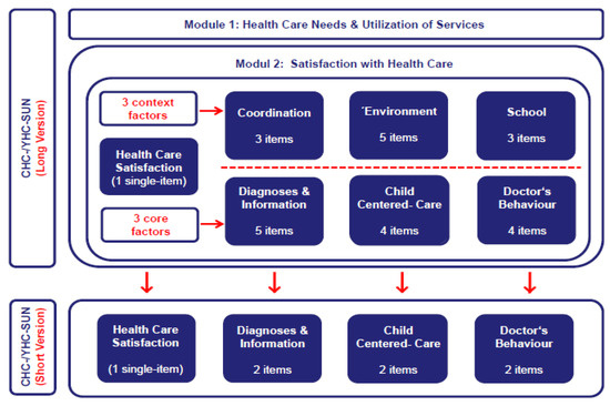 Health care satisfaction, utilization, and needs: Both versions (self-report, parents report) of the original long-form measure of CHC-/YHC-SUN were applied. This measure consists of 40 items in total, assigned to two different core modules. The first module includes 14 items and refers to the use of and the demand for health care services (“provision of services”), with special emphasis on the assessment of unmet special health care needs. The second module relates to “satisfaction with care” and covers the subjective perception and evaluation of the quality of the provision of health care services. This module consists of 6 different scales with 25 items and an additional single-item measure assessing satisfaction with health care in general. As opposed to this single-item measure, the six scales relate to specific domains of health care, namely, “diagnosis/information”, “doctor’s behavior”, “child-centered care”, “coordination”, “hospital environment”, and “school” (cf. Figure 1). Internal consistencies of the subscales range between α = 0.80 and 0.95 for the CHC-SUN and between α = 0.75 and 0.93 for the YHC-SUN. Items were selected based on content-related expert rating as well as psychometric criteria. Validity was demonstrated with respect to construct, content, and discriminant validity [8,9].