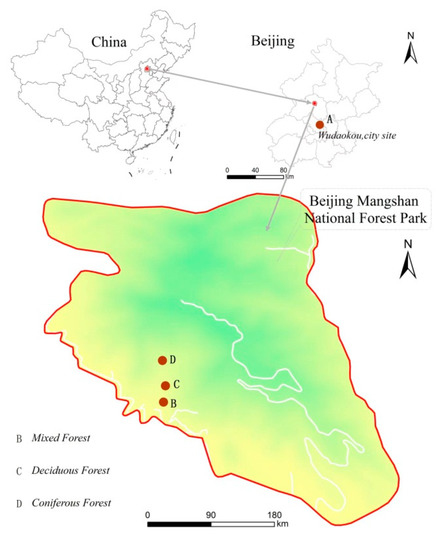 Participants were exposed to three different types of forests and an urban site located in Beijing, China (Figure 1). All the forest sites were in Mangshan National Forest Park, the largest national forest park in Beijing, which is 40 km away from the city. The total area of the Mangshan National Forest Park is 8622 ha, and the forest coverage rate is 86%. The urban site was a city square in the center of downtown.