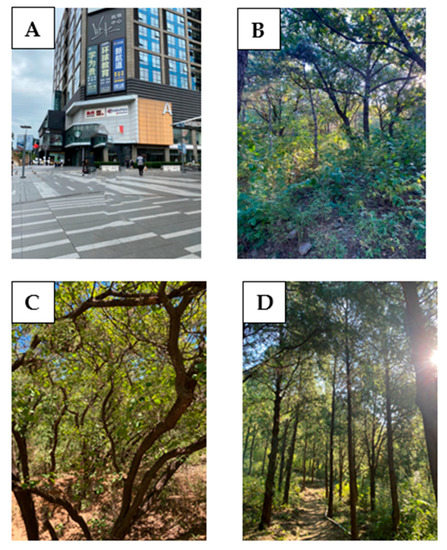 Photos: (A) city site, (B) mixed forest, (C) deciduous forest, (D) coniferous forest.