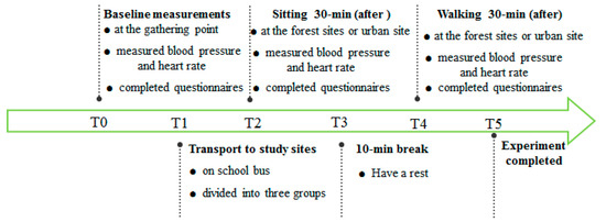 The experiment took place in June 2021 in sunny weather conditions. Participants were exposed to each of the study sites at the same time of a different day. The study protocol was the same for each experiment (Figure 3). Participants gathered in a classroom of Beijing Forestry University at 8 a.m. of each study day and had their blood pressure and heart rate measured and completed all questionnaires at the gathering point as baseline measurements. The procedure of obtaining baseline measurements took nearly 10 min. Afterward, participants were transported to the study sites by a school bus (nearly 40 min). While on the bus, participants were randomly and evenly divided into three groups, with 10 participants in each group (group A, group B, and group C). The participants were asked to sit at the selected spot for 30 min in the respective forest sites. After sitting, researchers conducted blood pressure and heart rate measurements, and then the participants finished the questionnaires at the sitting sites. After taking a break for 10 min, participants were asked to walk 30 min with a speed of moderate energy expenditure. After walking, the participants chose a flat and comfortable place to sit down and rest for 3 min, researchers conducted blood pressure and heart rate measurements, and then participants completed the questionnaires. The entire experimental procedure required each participant to visit four study sites including three forest sites (three different types of forests) and one urban site. Each person only visited one forest site on one day. All participants visited three forest sites and an urban site in order to increase the validity of the study. All 30 participants visited the urban site at the same time of day and were evenly and randomly divided into three groups guided by three researchers in each group in order to conduct the measurements. During the experiment period, talking, eating, and drinking energy drinks were not allowed.