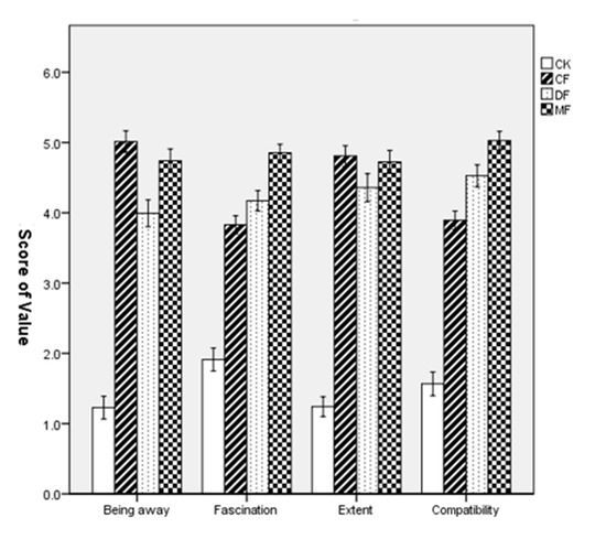 Comparison of the dimensional scores of PRS in four environmental sites. Data are presented as the means ± SEs. CK = city site, CF = coniferous forest, DF = deciduous forest, MF = mixed forest.