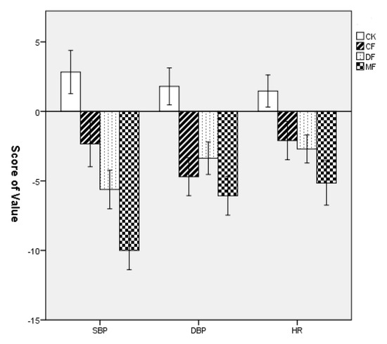 Comparison of reduction in values of SBP and DBP as well as HR in the four experimental sites. Data are presented as the means ± SEs. CK = urban site, CF = coniferous forest, DF = deciduous forest, MF = mixed forest.