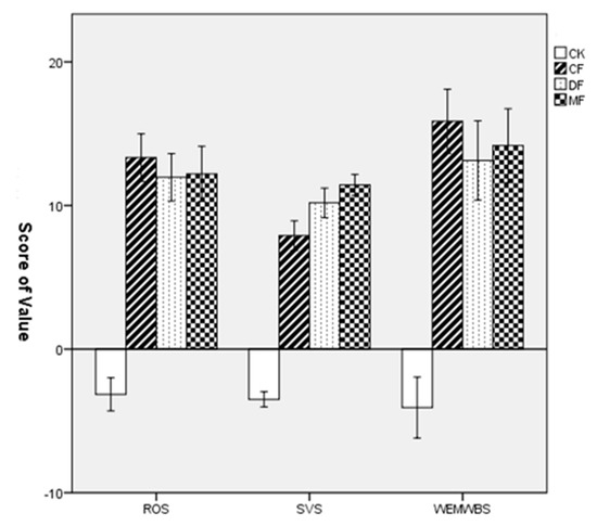 Comparison of the increased values of ROS, SVS, and WEMWBS in the four experimental sites. Data are presented as the mean ± SEs. CK = city site, CF = coniferous forest, DF = deciduous forest, MF = mixed forest.