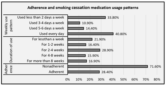 Adherence was assessed using the self-reported duration and weekly consumption pattern of smoking cessation medications during participants’ most recent quit attempts. Participants were labeled as adherent if they used smoking cessation medications for at least 4 weeks and on average for 5 or more days per week. Combining duration and weekly usage patterns gives better information than evaluating the duration of treatment alone [31]. Moreover, previous studies have also used this operational definition to define adherence [22,32].