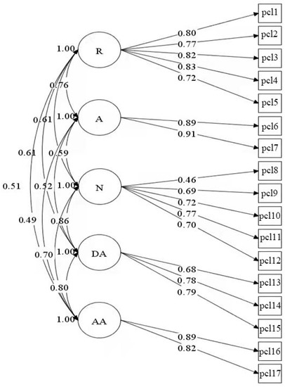Furthermore, the reliability of the optimal factor structure based on CFAs was also examined, including the internal consistency coefficient (Cronbach’s α) of potential factors [39], the scalability of dimensions (Loevinger’s H) [40], and consistency between items and dimensions (Hj-min) [40]. In addition, the convergent and discriminant validities of five-factor PCL were determined through the examination of a correlation matrix; the elements of this matrix were the correlation coefficients between items and rest scores [40].