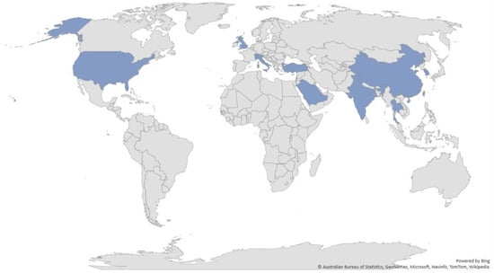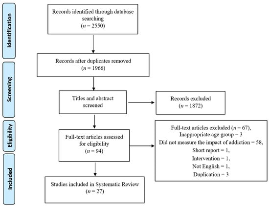 A total of 2550 potential studies were identified. After screening and removing duplicates, twenty-seven (27) studies were eligible for this review. A detailed study selection process based on the PRISMA flow chart is presented in Figure 1. Sample sizes ranged from 30 to 5372 adults (Table 1). Seven were conducted in South Korea [,,,,,,], three in Saudi Arabia [,,], four in China [,,,], four in Turkey [,,,], one in India [] one in Taiwan [], one in Switzerland [], one in the USA [], one in Italy [], one in Thailand [], and three were international studies [,,] (Figure 2). Smartphone addiction was measured in the study sample using different scales, however, the Smartphone Addiction Scale, Short Version (SAS-SV; n = 8) was the most common measure (Table 1). Among the selected studies, nine studies were considered to be “good”, seventeen articles were considered to be “fair”, and the remaining one was considered “poor” (Table 2).