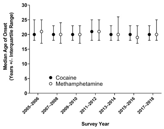 3.2. Trends in Age of Onset of Cocaine and Methamphetamine Use