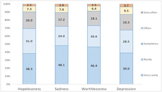 Because the COVID-19 pandemic is an uncontrollable event, it is surely affecting individuals’ depression. For example, Ni et al. [] showed that about one-fifth of a set of 1577 respondents in China reported probable depression (N = 303, 19.21%, 95% CI: 17.3–21.2%). Moreover, Ahmed et al. [] reported that more than one-third of respondents in their study (37.1%) exhibited different forms of depression (mild, 10.2%; moderate, 17.8%; and severe, 9.1%). Moreover, Al Banna et al. [] examined the effect of the COVID-19 pandemic on mental health for a representative sample of home-quarantined Bangladeshi adults and found that the rates of anxiety and depressive symptoms were 33.7% and 57.9%, respectively.