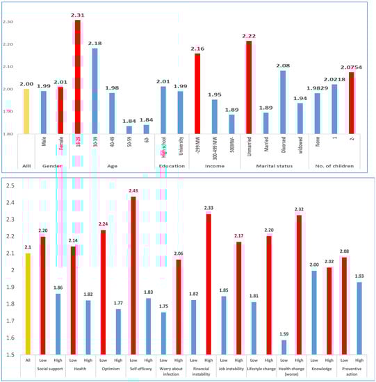 The perception of the risk of infection for family members and acquaintances may also affect mental health. Wang et al. [] showed that high levels of worry about other family members with COVID-19 are significantly associated with higher stress subscale scores. In addition, individuals with friends or relatives who contracted COVID-19 reported higher levels of depression and anxiety [,].