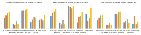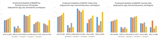 Model-based predicted values after adjustment for confounders are presented in Table 3 and Figure 2. After controlling for age, sex, parental education, and region of country, the proportions of participants reporting NMUPP changed only slightly (overall: 14.5%), with prevalence across race/ethnicity categories similar to crude prevalence reported above (NHB: 6%; NHW: 19%; Hispanic: 11%; and other: 10%), and with a gradient across income quartiles slightly diminished but still apparent (Q1: 13.3%; Q2: 13.8; Q3: 14.8%; and Q4: 16.0%). Statistically significant trends are seen in these overall numbers, as well as in the pattern for all females. The trend among Hispanic males was found to be marginally significant (p = 0.06).