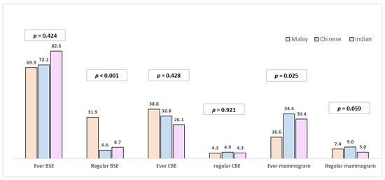 Figure 1 shows the difference in screening practices between the three major ethnic groups—Indian women most commonly reported to have ever carried out BSE. However, Malay women most commonly reported performing BSE regularly, followed by Indian and Chinese women (31.9%, 8.7% and 6.6%, respectively, p < 0.001). More Malay ethnic women also reported to have ever had a CBE (38%) compared to Chinese (32.8%) and Indian (26.1%) women; however, the difference was not significant. Less than 5% of women from all ethnic groups attended CBE regularly. Mammogram utilisation was highest among Chinese women, followed by Indian and Malay (34.4%, 30.4% and 16.6%, respectively, p = 0.025).