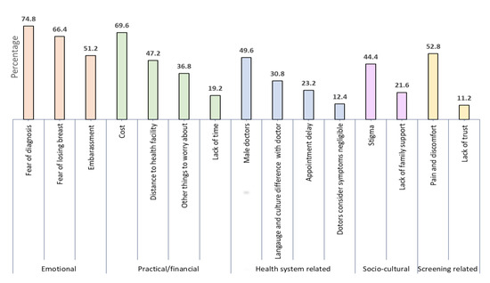 Self-reported barriers to screening and breast health are shown in Figure 2. Fear of diagnosis (74.8%), cost (69.6%) and fear of losing a breast (66.4%) were the commonest reported barriers. Emotional barriers were the most common, with all emotional barriers reported by more than half of the participants. Pain and discomfort associated with screening (52.8%), embarrassment (51.2%), having to approach a male doctor (49.6%), distance to the health facility (47.2%), and stigma (44.4%) were also commonly reported barriers.