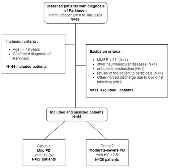 Flowchart of the study. Legend: MMSE = Mini-Mental State Examination; PD = Parkinson’s disease; HY = Hoehn and Yahr staging scale.