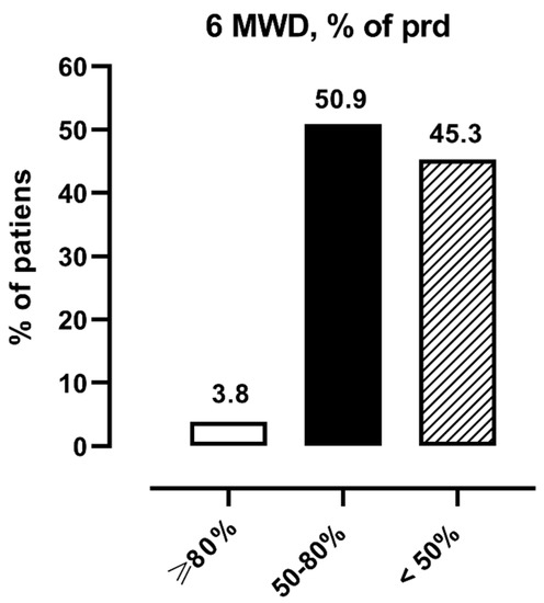 Figure 2 shows the distribution of patients according to level of performance at 6MWT: normal (≥80% pred.), moderately reduced (50–80% pred.), and severely reduced (<50% pred.).