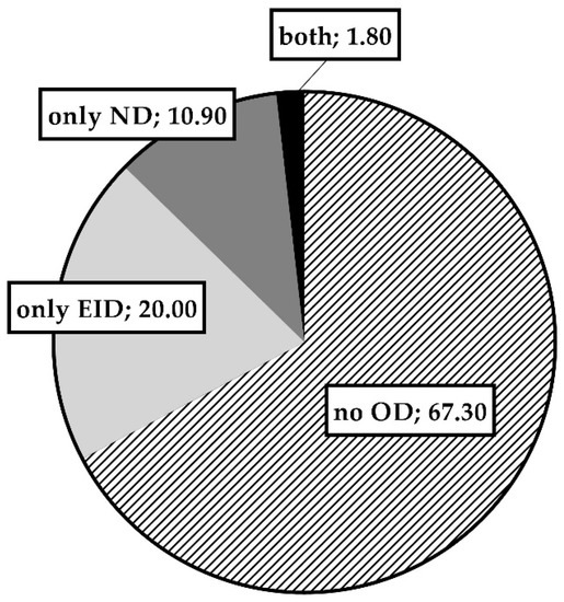 Percentage of patients not presenting oxygen desaturation (no OD), presenting exercise-induced desaturation only (only EID), nocturnal desaturation only (only ND), and both exercise and nocturnal desaturation (both).