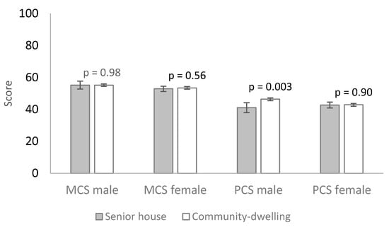Our findings showed that men in senior houses had lower physical functioning than community-dwelling men. The PCS difference of 5.3 points can be considered as clinically meaningful [,]. Our study findings are partly in accordance with a recent study [] in which the investigators did not find differences in physical functioning between older adults living in senior housing and in the community. However, PCS mean scores were slightly lower in their study compared to ours. In addition, they did not look into sex differences in their study. Another study focusing on the use of health and medical services reported that older adults living in senior housing had better self-rated health than older adults living in the community []. It is possible that one of the main reasons an older person chooses to move to a senior house is due to reduced physical functioning, which would explain the differences we observed among men. Women may reside in senior housing for different reasons, such as loneliness. However, as stated in our inclusion criteria, the senior house residents were all living independently. Independent living requires the individual to be in somewhat good overall health.