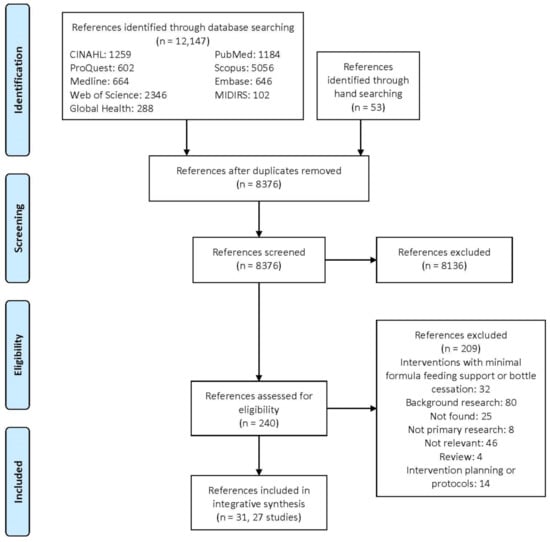 Figure 1 shows the PRISMA study flow diagram. A total of 12,147 references were identified through database searching, and 53 references were identified through hand searching. After removal of the duplicates, 8377 references were screened by the abstract and title for relevance, with 8137 references excluded. Two hundred and forty references were assessed for full-text eligibility. A total of 209 references did not meet the inclusion criteria; of these, 32 references were interventions that were terminated or had minimal formula feeding or bottle cessation support in the wider context of the study intervention. Finally, 31 references were included for analysis, reporting 27 studies, programs, trials or interventions.