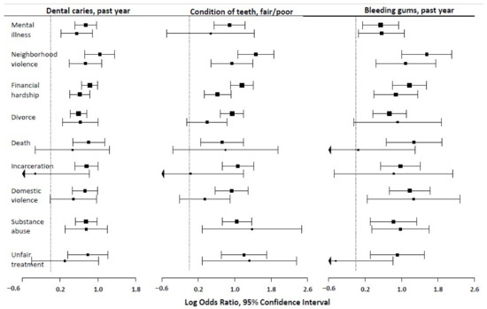 Bleeding gums is a consequence of inadequate attention (including a lack of supervision) paid to tooth brushing either by the child/adolescent or by the caregiver of the younger children. Indeed, bleeding gums is a better indicator of poor oral healthcare practices that is readily visible than dental hard tissue consequences such as tooth decay. Furthermore, poor oral health among children and adolescents may be reflective of chronic caregiver stress brought on by economic hardship that manifests in the form of inadequate parenting, caretaking and neglect [30], and less attention given to preventive oral healthcare needs [14]. Structural and psychosocial factors, especially poverty and financial hardships, may also contribute to parental/caregiver strain that results in the parent’s/caregiver’s inability to provide consistent dental care and oversight. Of note, we avoid using the terminology “dental neglect” when discussing the potential lack of dental care and oversight because dental neglect assumes “willful failure of parent or guardian, despite adequate access to care… [31]”. Considering that 25% of our sample reported experiencing financial hardships, it is likely that they did not have access to adequate dental care. Thus, our findings are contextualized within this frame of reference. Additionally poverty and financial hardship are associated with lower rates of private dental coverage [32] and dental coverage for individuals with Medicaid [33], which, in turn, has been linked to lower rates of preventative dental visits and higher rates of unmet dental needs [34]. Indeed, studies have shown that parenting stress and supervision improved when economic hardship is reduced [35,36] and, thus, have the potential to minimize if not prevent some ACEs, such as violence in the home and neighborhood.
