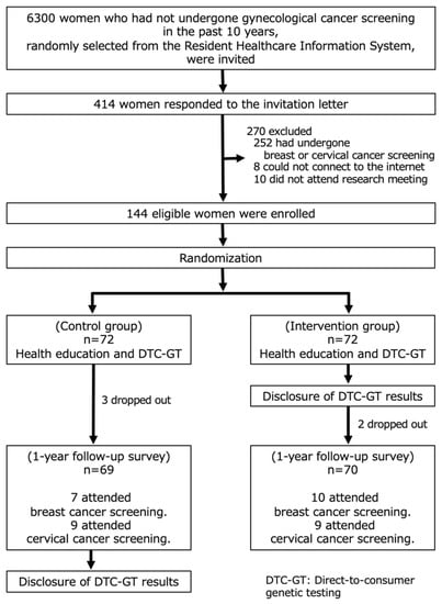 The aim of this randomized controlled trial (RCT) was to clarify the short-term effects of DTC-GT on breast and cervical cancer screening uptake among middle-aged never-screened Japanese women.