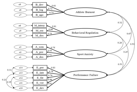 The results of the model produced by CFA are featured in Figure 1. This model represents a factorial structure consisting of four constructs or latent variables (behavioural regulation, sport anxiety, burnout and fear of failure) and 14 observable variables (items or indicators of latent variables), which show the factor loadings between constructs and observable variables, as well as the correlations between constructs. From the resulting model, the observable variables for each construct present suitable factor loadings, with values significantly different from zero and greater than 0.5, with the lowest value being 0.61 (sport devaluation factor of burnout) and the highest being 0.96 (external motivation factor of behavioural regulation). This produced an average variance extracted of 71.4% in the case of behavioural regulation in sport, 46.2% in the case of sport anxiety, 48.0% in the case of burnout, and 65.8% in the case of fear of failure (Table 3).