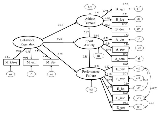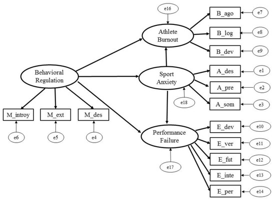 The initial hypothetical model considered that behavioural regulation would be able to positively predict burnout and fear of failure, mediated by sport anxiety (Figure 2). This general model was tested on a confirmatory basis and identified a number of satisfactory fit indices.
