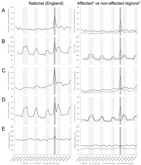 Daily (A) emergency department attendances for asthma; (B) NHS 111 calls for difficulty breathing; (C) NHS 111 online assessments for difficulty breathing; (D) out of hours general practitioner contacts for difficulty breathing/wheeze/asthma; and (E) ambulance calls for breathing problems for England (left panels) and stratified by storm affected and non-affected regions (right panels). 1 Counts aggregated across London, Southeast, East of England regions; 2 counts aggregated across Northwest, Northeast, Yorkshire and Humber, West Midlands, East Midlands, and Southwest regions.