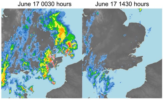 A retrospective review of the meteorological conditions on the night of June 16 between 22:00 and 06:00BST (June 17) showed several localised, weak or moderate thunderstorms specifically across parts of Southeast England (Sussex, Kent, East London, Essex and East Suffolk) moving northeast-wards (Figure 2). The last notable thunderstorm had left the east coast by 06:00BST and was followed by a general widespread area of moderate to heavy rain across much of the Southeast (with no lightning), which dissipated by 11:00BST. The prevailing weather conditions overnight and into the day of June 17 were warm and humid (high dewpoints up to 16 or 17 °C, temperatures 18–21 °C) with very light winds, and likely rather damp following the overnight rain and thunderstorms.
