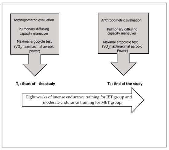 Sixteen healthy young male athletes (16–18 years old) participated in the study and were randomly assigned to two different training groups: an intense endurance training program (IET, n = 8) and a moderate training program (MET, n = 8). The participants were middle-distance runners recruited from an athletic center in Nabeul (Tunisia). All participants had been engaged in systematic training programs and in national competitions during the previous six years. The participants were non-smokers with normal vital capacities and no histories of cardiopulmonary diseases or allergies. A schematic representation of the experimental design is illustrated in Figure 1.