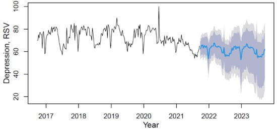 Based on the forecast results, the future trend can be characterized as slightly negative with rhythmic seasonality. The mean value of the “depression” indicator in the forecast period (from September 2021 to September 2023) will decrease in comparison with the period under review by 15.3%.