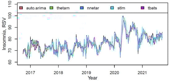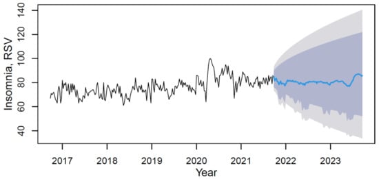 Based on the forecast results, the future trend can be characterized as steady positive without visible seasonality. The mean value of the “insomnia” indicator in the forecast period (from September 2021 to September 2023) will increase compared to the period under review by 5.2%.