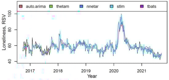 Loneliness is described as the perceived disparity between the actual and expected social relationships []. According to conducted studies, the COVID-19 pandemic will significantly impact people’s well-being and health. The findings of Brodeur et al. indicate that mental health has been severely affected by the COVID-19 pandemic. The authors observed a significant increase in online searches for loneliness []. Children and adolescents are more likely to experience depression after isolation; the longer the loneliness lasted, the more severe were the mental health problems []. Loneliness and forced social isolation affect older adults as well and contribute to their physical and mental health []. Shah et al. suggest that in order to reduce loneliness during lockdowns, people should access digital technology to maintain contact with others []. The broader use of digital technology to connect with loved ones may partially explain the decrease in the near future interest in the phrase “loneliness”, predicted in our study. Moreover, it might be explained as natural habituation to difficult conditions [] accompanied by the gradual removal of lockdown and social distancing rules that had been announced due to the anticontagion policies.