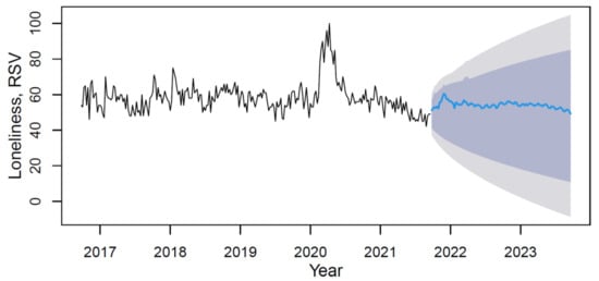 The loneliness’s data time series plot (solid black line) with forecast (solid blue line) on light grey (95% CI) and dark grey (80% CI) backgrounds by applying the M3 hybrid model.