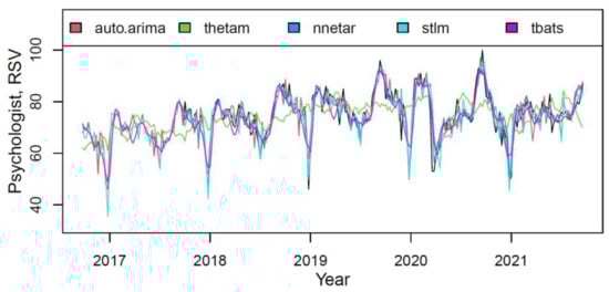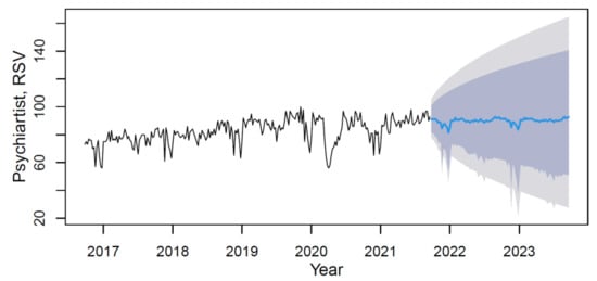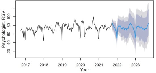 Based on the forecast results, the future trend can be characterized as steady with rhythmic low-magnitude seasonality. The mean value of the “psychiatrist” indicator in the forecast period (from September 2021 to September 2023) will increase in comparison with the period under review by 8.4%. Given the relatively stable values of the forecasted RSV in 2021–2023, the main reason for the growth lies in the significantly lower comparative indicators in the period until 2019.