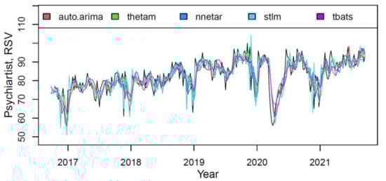 Our study predicts more significant interest in “psychiatry” and near stable interest in “psychologist” expressions in the near future. The challenging times of the COVID-19 pandemic have shown a growing public health burden due to more psychiatric and mental disorders [,], which might explain the predicted increase in “psychiatrist” expression. However, the negative impact of the pandemic on mental health can push psychiatric services to the limit []. Nevertheless, adequate support should be provided to help those struggling with mental health problems during the pandemic. As Lancet Psychiatry reports [], conducting research during a public health crisis is challenging, so an ambitious mental health program is needed. A large sample of information obtained from Google search engine users worldwide could assist in anonymous, timely data collection without generating high costs. Such a survey may be carried out to identify and assess social needs in multiple fields, as well as predict the mental health outlook for a given population. During the COVID-19 pandemic, the ability to track emerging trends in mental health symptoms can guide public health responses. As changes in mental health can escalate, ongoing surveillance is important. GT can be used to predict population mental health needs [].