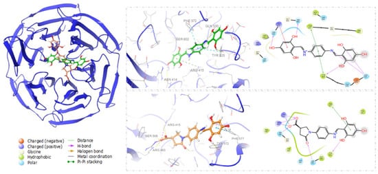 The electronic and energetic states of both compound SH-29 and compound SK-119 were examined and represented in the form of MESP, HOMO, and LUMO in Figure 4. For both compounds, SH-29 and SK-119, the HOMO’s outcome ranges from −0.127 to −0.222 and LUMO −0.014 to −0.113. The orbital energy and the difference between HOMO and LUMO energy (gap energy) were also estimated. HOMO and LUMO’s energy gap of SH-29 was 0.114, and SK-119 was 0.109. Table 2. Based on distribution charges, HOMO and LUMO orbitals on compounds SH-29 and SK-119 were analyzed to identify the nucleophilic and electrophilic sites, whereas LUMO serves as an electron acceptor (electrophilic) and HOMO serves as an electron donor (nucleophilic). The orbitals (HOMO and LUMO) of compound SH-29 were distributed nearby the space on hydroxyphenyl’s benzene ring and imine bond, and in compound SK-119, HOMO and LUMO orbitals were distributed near the benzene ring and imine bond. Following this, MESP was also examined to calculate the electrostatic potential regions, physiochemical property, and hydrogen bonding interactions along with shape and size of ligands in terms of color, in which the blue color-coding region (signifying electron-deficient region) represents the most positive electrostatic potential and the red coding region (signifying electron-rich) represents the most electronegative potential of the molecules. The intermediate color-coding regions are orange, green, and yellow, and they prove the areas with electrostatic potentials close to zero. MESP map of the most electropositive region in compound SH-29 was found near the NH atom of imine portion and the hydrogen atoms of hydroxyl groups, and in the case of compound SK-119, it was observed with less potential positive effect. The most negative potentials were found around the oxygen atoms of the carboxyl group of SK-119 and for SH-29 around the oxygen atom of hydroxyl groups, although less profound. The 3D MESP analysis shows that the hydrogen bond donor and hydrogen bond acceptor site of SH-29 are found at the hydrogen atoms of hydroxyl groups and the oxygen atom of the phenyl moiety and imine nitrogen atom moiety, respectively. Whereas for SK-119, the vital activity comes from the carboxylic oxygen atoms of the oxopyrrolidine moiety.