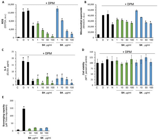 SH-29 and SK-119 attenuate DPM-induced damage. HaCaT cells were treated w/o or with the indicated SH-29 or SK-119 concentration and exposed to DPM. After 45 min., cytosolic (A) or mitochondrial (B) ROS levels were measured by DC-FDA or MitoSOX, respectively. After 24 h, IL-8 secretion (C) and cell viability (D) were determined by designated ELISA assay and MTT. In addition, the direct ROS scavenging capacity was evaluated by the DPPH method (E). n = 3; */# p < 0.05 for signification different from naïve control cells or DPM-stimulated group, respectively. C—control; D—DPM; V—vehicle, DMSO at 0.1%; N—N-acetylcysteine; SH for SH-29 and SK for SK-119.