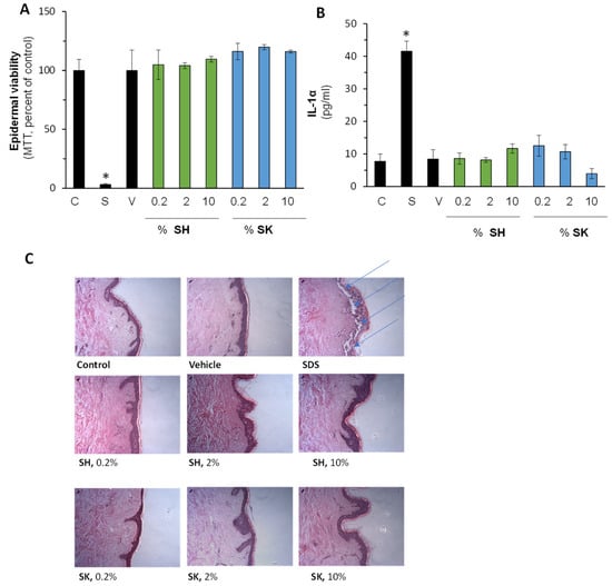 Safety evaluation of SH-29 and SK-119 in the ex vivo human skin organ culture. The compounds were applied topically on the epidermal layer of the skin samples in the indicated concentrations. After 24 h, epidermal viability was determined by the MTT assay (A). Concomitantly, IL-1α levels in the spent media were evaluated by ELISA (B). In addition, skin morphology after hematoxylin eosin (H&E) staining was assessed qualitatively (C). Blue arrows depict damaged (necrotic) tissue. n = 3; * p < 0.05 for signification different from naïve control tissues. SH-29 and SK-119 were tested at 0.2, 2 and 10% (w/v). C—control; V—vehicle, DMSO at 0.1%; S—SDS at 10%.