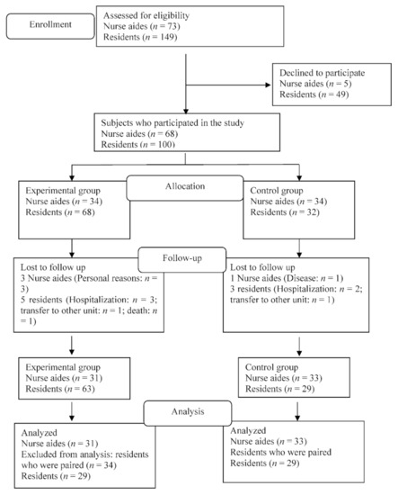 In this study, nurse aides and residents from a large long-term care facility in Taipei were enrolled from 24 May 2020 to 30 July 2020, by purposive sampling (subjects residing on the first and second floors were included in the control group and those on the third and fifth floors were included in the experimental group). A total of 73 nurse aides met the inclusion criteria, and 64 nurse aides completed the study, with 31 in the experimental group and 33 in the control group. A total of 149 residents met the inclusion criteria, and 100 of them agreed to participate in the study, with 68 subjects assigned to the experimental group and 32 subjects assigned to the control group. The attrition rates of nurse aides and residents were 5.9% and 12.1%, respectively. Because of the great difference in the number of residents enrolled between the two groups, samples were paired by the predictive factors that affect the quality of sexual life, including sex, age, education background, religious belief, and ethnicity, which were determined by literature review. Finally, 29 residents completed the study in each group. Refer to Figure 1 for details.