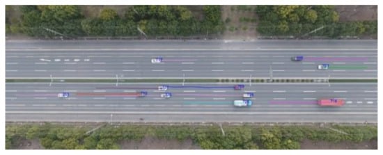The length of the UAV video coverage area is about 250 m. The time period of each video is about 15 min due to the battery. Thirty videos were collected at a highway in Shanghai, China, during off-peak hours from 10:00 a.m. to 12:00 a.m. The highway consists of eight lanes, including two right-turn lanes and two left-turn and straight lanes. Video processing software developed by Nanjing University of Science and Technology was used to extract the vehicle driving data from the UAV videos, as shown in Figure 3. The vehicle information that the software can directly extract includes vehicle ID, time, position information, speed, acceleration, vehicle type, and preceding vehicle ID. It can help to match two following vehicles, which can help to study the relative position and assess collision risk. The data extraction frequency was 10 Hz. The extracted vehicle behavior trajectory can be stored in Excel and imported into MATLAB software for analysis. In order to ensure the accuracy of data extraction, the difference between the actual speed of a naturalistic driving vehicle (measured directly by equipped sensors) and the extracted speed (UAV video) was within 3.5%.