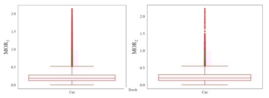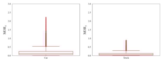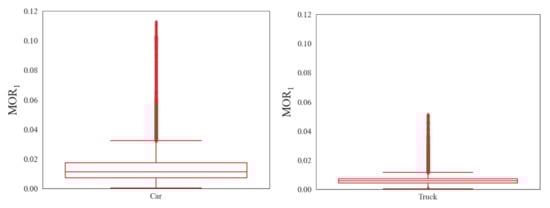 A boxplot of speed-unstable driving samples is shown in Figure 4. It is known that a smaller value of MOR1 indicates lower collision risk. Therefore, the upper boundary was taken as the threshold value to detect risky driving behavior. The threshold values of MOR1 for cars and heavy trucks are, respectively, 0.03 and 0.01. The threshold value for heavy trucks is much lower than that of passenger cars, indicating that heavy truck drivers tend to maintain a stable driving velocity. This may result from the fact that the acceleration and deceleration performance for heavy trucks is worse than that of passenger cars.