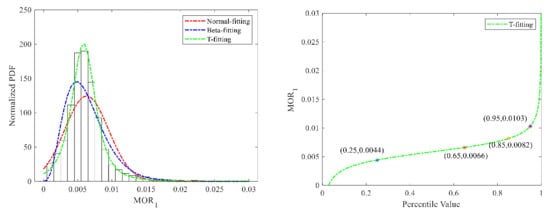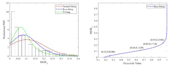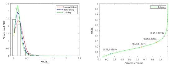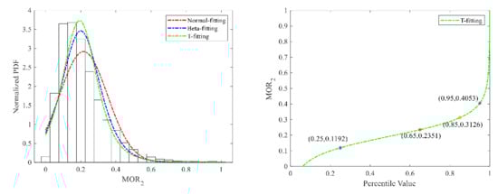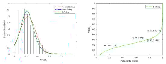 We adopted the Normal distribution, Beta distribution, and T distribution to fit the MOR1 distribution, as shown in Figure 7. The mean-square error (MSE) between the distribution fitting curve and real data were calculated for the three types of distribution to select the best one. The MSE values for the three distributions are, respectively, 12.03, 10.98, and 11.05. According to the fitting results, the Beta distribution can better describe the features of the MOR1 distribution. Therefore, the Beta distribution was selected to fit the distribution. The slope of the cumulative distribution curve changed greatly at 90–99%. Therefore, we selected the 95% percentile value as the threshold value, which is 0.03 for car drivers. The fitting results of truck drivers are shown in Figure 8, and the T distribution shows better performance. The 95% percentile value of the T cumulative distribution curve was calculated as the threshold value, which is 0.01. The threshold value of heavy trucks is still lower than that of passenger cars.