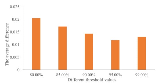 We also conducted a sensitivity analysis to evaluate the impact of the threshold value on the recognition results. We selected 80%, 85%, 90%, 95%, and 99% as threshold values to detect risky driving behavior. The absolute difference in risky behavior between the training and testing datasets with the five threshold values is shown in Table 5. The average difference is shown in Figure 13. It can be seen that the average difference decreases with the improvement in the threshold value and reaches the lowest point with the 95% threshold value. Then, the difference increases from 1.81% to 2.14% when adopting the 99% threshold value. By comparing the five threshold values, we can see that the 95% threshold value is the most suitable to recognize risky driving behavior.