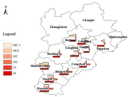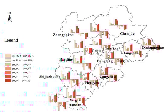 As shown in Figure 5, for PM2.5, the cities with the best pollutant reduction effect are Xingtai, Shijiazhuang and Handan; for PM10, Shijiazhuang, Beijing and Xingtai are the cities with the largest decrease in pollutant concentration; for SO2, emission reduction effect in Shijiazhuang, Xingtai and Handan are the best; for NO2, only Beijing has achieved significant emission reduction of NO2; the concentration of CO decreases significantly in Hengshui, Cangzhou, Tangshan, Xingtai and Shijiazhuang; for O3, the pollutant emission reduction effect in Handan, Hengshui and Xingtai are the best. On the whole, the emission reduction effect of cities located in the south of the BTH region are better and the cities in the north of the BTH region have great potential for pollutant emission reduction. Based on the above results, the local governments of different cities should formulate specific measures to implement the BSDW policy according to their own characteristics.