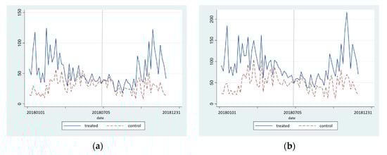 where the dependent variable Air qualityi,t refers to the monitoring station’s daily concentration of PM2.5, PM10, SO2, NO2, CO, O3 and other air pollutant used in the robustness analysis (AQI). treati,t represents the monitoring station i at day t. It is equal to 1 if the monitoring station is located in the city where the policy is implemented, otherwise it is equal to 0. timei,t is a dummy variable that represents the BSDW policy and is equal to 1 since 5 July 2018, otherwise it is equal to 0. timei,t × treati,t notes the interaction item of these two dummy variables. Xi,t represents control variables related to the environmental pollution, namely the meteorological factors (including daily temperature, daily longitude wind speed, daily latitude wind speed, relative humidity and daily surface pressure). The individual-fixed effects αi and the day-fixed effects δt are included to exclude the interference of other possible confounders. βi is the vector of the coefficients of each independent variable. β0 represents the constant term. β1 and β2 represent the coefficient of treati,t and timei,t, respectively. The coefficient of timei,t × treati,t (β3) captures the reduction effect of the policy on the treatment group [], namely the concentration reduction amount of air pollutants, which can effectively avoid the endogenous problems caused by omitted variable bias and accurately reveal the net policy impact []. The basic principle of DID method is to build the difference-in-difference statistics reflecting the policy effect, that is, the coefficient of the interaction term β3, by comparing the differences between the control group and the treatment group before and after the implementation of the policy, so as to obtain the desired net effect of the policy []. A negative estimated coefficient (statistically significant) denotes a significant reduction in the pollutant concentration in the region because of the BSDW policy, indicating that the emission-control policy has played a positive and significant role. εi,t denotes random disturbance term.