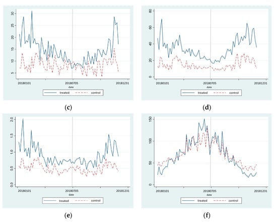We investigate whether the DID parallel trend is likely to exist. The original hypothesis of the parallel trend test is that before the implementation of the policy, the change trend of target variables over time is basically the same in the treatment group and the control group. To assess the plausibility of the parallel trend, the mean of the dependant variables for the treatment group and the control group can be plotted to assess the plausibility of the parallel trend [,]. Figure 2. indicates that the different groups appear to evolve along a similar temporal path, at least prior to treatment. After the implementation of the BSDW policy in the treatment group, a significant difference in slope can be detected after the implementation of the BSDW policy (in Figure 2 a,c,d,f). Thus, existing evidence indicates that parallel trends roughly exist, therefore, it can be concluded that the results based on DID method in Section 4.2 are robust.