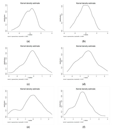 In addition to the parallel trend assumption test, we also test the effect of unobserved variables. The DID method is helpful for reducing the number of control factors to be considered in the model. To eliminate the effect of unobserved variables, this paper controlled the regional characteristics and adopted the two-way fixed effect model in the basic regression. However, it may still be difficult to observe and control some factors that change over time and space. Specifically, different industrial policies carried out by local governments in different regions may affect the upgrading of manufacturing industry, finally resulting in the estimation error. In order to eliminate the effect of unobserved factors, following the studies of La Ferrara et al. [] and Liu and Lu [], this paper uses the following method to indirectly test whether the unobserved characteristics of these regions will affect the estimation results.